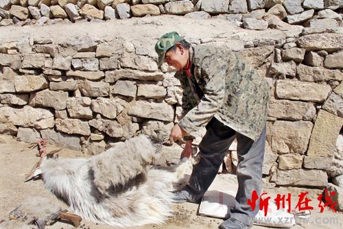 岢嵐縣西豹峪鄉(xiāng)謝家坪村農(nóng)民王占財,通過十多年努力,成為當(dāng)?shù)剡h近聞名的養(yǎng)羊大戶。目前,他共飼養(yǎng)了240 余只晉嵐絨山羊,在每年三、四月份的抓絨期,便可收入20000余元。圖為他在抓絨。(李俊武 攝)