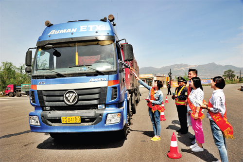 5月13日上午,代縣公路管理段組織路政執(zhí)法人員和共青團(tuán)員,深入到陽明堡鎮(zhèn)治超點(diǎn)和四岔路口開展以“依法治路保障暢通,愛護(hù)橋梁保障安全”為主題的路政宣傳月活動。(石俊文 攝)