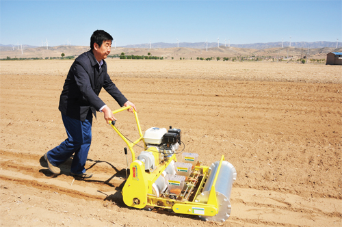 5 月14 日上午,位于繁峙縣金山鋪鄉(xiāng)郝家灣村的海豐農場的谷子試驗田里,山西農業(yè)大學教授郭平毅正在為村民們演示韓國產小籽粒播種機的操作要領。山西農業(yè)大學開展“送技術下基層”活動,他們?yōu)楹XS農場送來了2 臺韓國產小籽粒播種機。(喬偉 攝)
