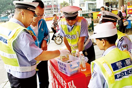 考試期間,市公安局交警支隊(duì)在各考點(diǎn)設(shè)置了便民服務(wù)點(diǎn),備好遮陽(yáng)傘、雨傘、保溫水桶、礦泉水和考試專(zhuān)用的鋼筆、橡皮。便民服務(wù)臺(tái)還放置一個(gè)小藥箱,里面?zhèn)溆星鍥鲇汀⒎朗钏?、藿香正氣水、感冒藥、腹瀉藥、速效救心丸、降壓藥等應(yīng)急藥品,以防考生及家長(zhǎng)急用。