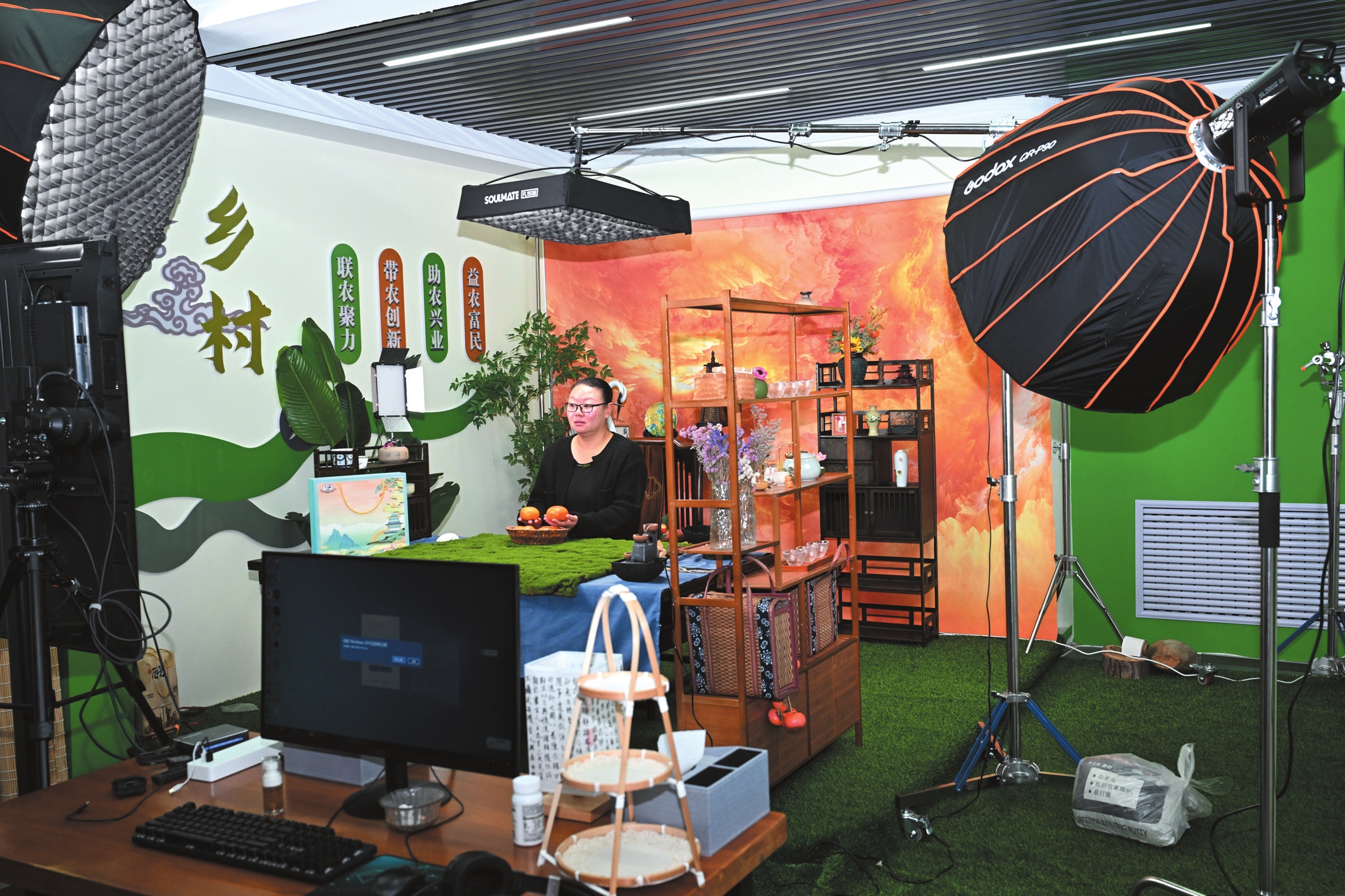 五臺(tái)縣臺(tái)城鎮(zhèn)充分發(fā)揮到村工作大學(xué)生的知識(shí)優(yōu)勢(shì),積極建起電商中心,已重點(diǎn)推出陽(yáng)白鄉(xiāng)蜂蜜、陳家莊花椒、臺(tái)城鎮(zhèn)六道木文創(chuàng)手串三類12種產(chǎn)品,日均銷售6000元,單日成交額最高達(dá)3萬元。圖為主播直播帶貨賣柿子。(金俊賢攝)