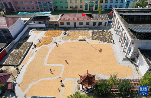 10月14日,農(nóng)戶在山東省臨沂市沂南縣蘇村鎮(zhèn)寶珠村廣場(chǎng)上晾曬糧食(無(wú)人機(jī)照片)。(新華社發(fā) 尹君 攝)