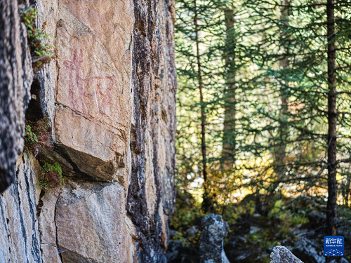 10月21日拍攝的海子山老林溝拉托扎巖畫,能明顯看到鹿的軀干和鹿角。(新華社記者 薛晨 攝)