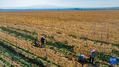10月29日,農(nóng)民在寧夏吳忠市紅寺堡區(qū)紅寺堡鎮(zhèn)弘德村晾曬蘿卜條。(新華社記者 楊植森 攝)