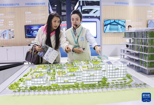 11月6日,講解員(右)在住博會上向觀眾介紹展出的節(jié)能建筑。(新華社記者 潘旭 攝)
