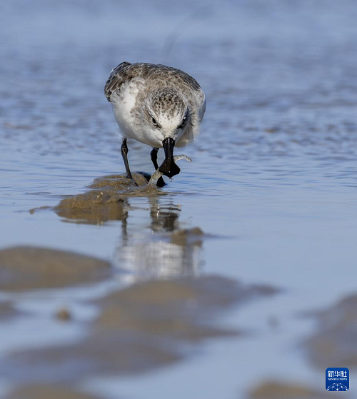 11月9日,一只勺嘴鷸在泉州圍頭灣灘涂上覓食。(新華社記者 魏培全 攝)