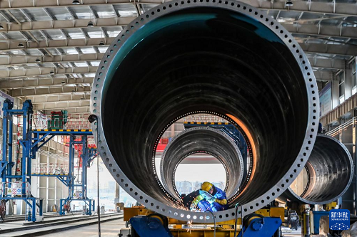11月20日,在甘肅省酒泉經(jīng)濟(jì)技術(shù)開發(fā)區(qū)的中國水電四局(酒泉)新能源裝備有限公司塔筒制造車間,工作人員進(jìn)行風(fēng)機塔筒焊接作業(yè)。(新華社記者 郎兵兵 攝)