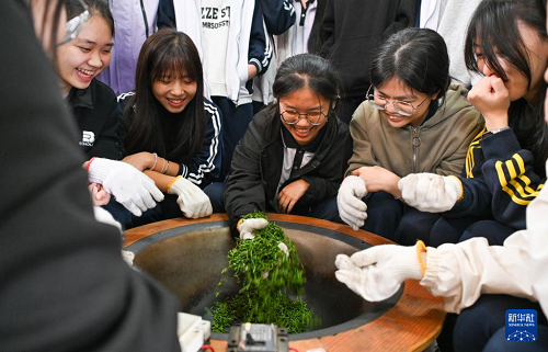 在海南省白沙黎族自治縣五里路茶園,學(xué)生在體驗炒茶(11月20日攝)。(新華社記者 楊冠宇 攝)
