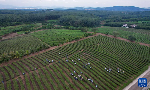 在海南省白沙黎族自治縣五里路茶園,學(xué)生在體驗采茶(11月20日攝,無人機照片)。(新華社記者 楊冠宇 攝)