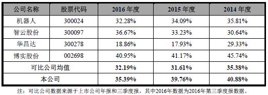 2014年至2016年,同行業(yè)上市公司綜合毛利率均值分別為35.38%、31.61%、32.19%。克來機(jī)電綜合毛利率高于可比公司均值。