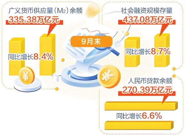 9月末,M2余額335.38萬億元,同比增長8.4%,在上年同期高基數(shù)背景下,仍保持較高增速;社會融資規(guī)模存量437.08萬億元,同比增長8.7%,比上年同期高0.7個百分點;前三季度,社會融資規(guī)模增量累計為30.09萬億元,同比多增4.42萬億元。