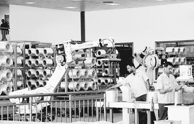 2015年,新蘇伊士運(yùn)河的開通拉動(dòng)了埃及的制造業(yè)和基礎(chǔ)設(shè)施建設(shè)。圖為在北非最大的玻璃纖維制造企業(yè)埃及巨石公司,埃及員工與“機(jī)械手臂”一同生產(chǎn)的場(chǎng)景。王云松攝