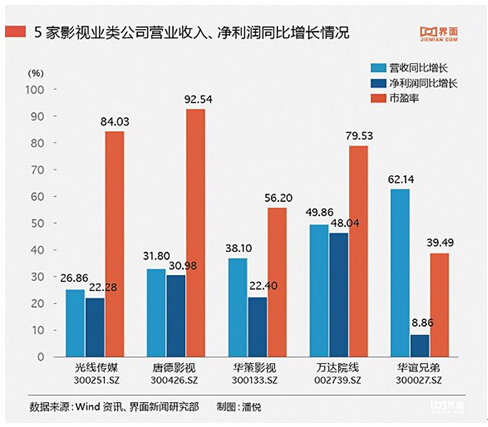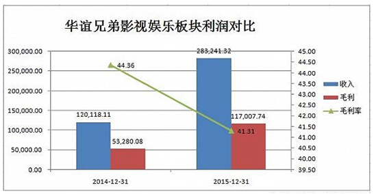 據(jù)界面報(bào)道,根據(jù)財(cái)報(bào)顯示,華誼兄弟2015年影視娛樂(lè)版塊營(yíng)業(yè)收入較上年同期相比增135.80%,達(dá)到28.32億元,營(yíng)業(yè)成本較上年同期增長(zhǎng)135.80%,達(dá)到16.62億,毛利率較上年減少了3.05%,達(dá)到41.35%。在報(bào)告期內(nèi),公司上映的主要是《奔跑吧兄弟》《天將雄師》《梔子花開(kāi)》、《命中注定》《尋龍?jiān)E》《老炮兒》等16部,電影的總票房約43億。
