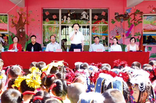 圖為市委書記李俊明在岢嵐縣春芽幼兒園與師生共慶“六一”,他向幼兒園小朋友們表示節(jié)日的祝賀,并向全市少年兒童表示節(jié)日的問候。馬毅龍 攝