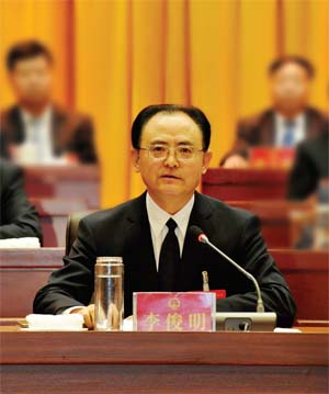 省人大常委會副主任、市委書記李俊明在市四屆人大四次會議閉幕大會上作重要講話。本報記者 劉紀(jì)森 攝