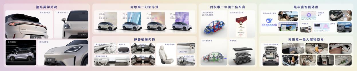 步入“舒嶼座艙”,細(xì)節(jié)皆巧思。繽果S以“靜奢棲居美學(xué)”為靈感,通過環(huán)抱式布局、貫穿式內(nèi)嵌風(fēng)幕與柔感貝殼座椅等設(shè)計,營造出沉浸式的舒適氛圍。搭配同級唯一的6揚聲器系統(tǒng)與阿嘉米斯專業(yè)聲場調(diào)校,進(jìn)一步提升了座艙的靜謐質(zhì)感與聽覺享受。12.8英寸高清大屏內(nèi)置“1+N”靈語AI中樞大模型,深度融合DeepSeek大模型,以更全面的壁紙玩法、八大區(qū)域的方言溝通、更多的智能場景應(yīng)用,為用戶帶來真正“更懂你的”智能座艙體驗。