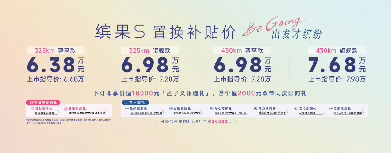 繽果S共推出325km尊享款、325km旗艦款、430km尊享款、430km旗艦款四款配置,上市指導(dǎo)價為6.68萬-7.98萬元,疊加置換政策可享置換補貼價6.38萬-7.68萬元,更可疊加享受至高20,000元的國家/地方購車補貼。