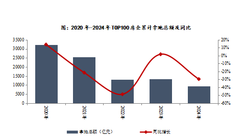 但是綜合來看,2020年-2024年間,TOP100企業(yè)拿地總額總體呈下滑趨勢,2024年不足2020年的三成,特別是民營房企拿地銳減,這與房地產(chǎn)市場下行、融資環(huán)境偏緊、民營房企違約事件頻發(fā)密切關(guān)聯(lián)。