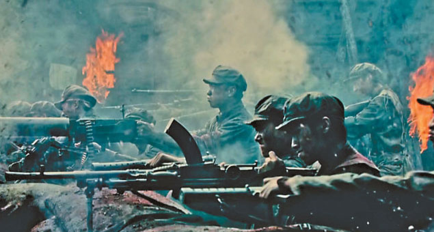 在《浴血榮光》中,陳力導(dǎo)演延續(xù)了其真實(shí)厚重、沉郁激越的影像風(fēng)格,讓影像深度參與敘事,劇集對(duì)于不同的場(chǎng)景敘事采用了不同的影像風(fēng)格。南昌起義、三壩河阻擊戰(zhàn)、井岡山叢林游擊戰(zhàn)等戰(zhàn)斗大場(chǎng)面,炮火紛飛、震撼人心;而與家庭相關(guān)的影像則趨向溫暖動(dòng)人。