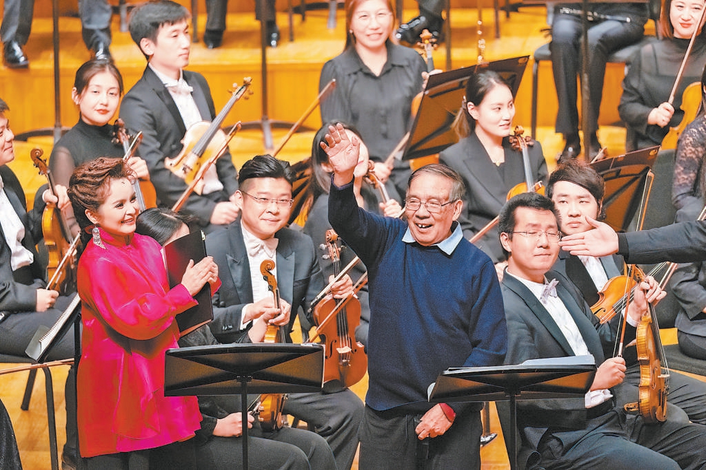吳碧霞、黃訓(xùn)國的演唱同樣精彩,特別是在《小河淌水》《看秧歌》等選段中,吳碧霞的美妙高音與混聲合唱的互動鮮明流暢,總博得熱烈喝彩。最后一曲《孳孳》唱響,余韻中,鮑元愷登臺向觀眾致意,筆耕不輟、用幾十載時光豐盈“炎黃風(fēng)情”的作曲家,收獲全場經(jīng)久不息的掌聲。