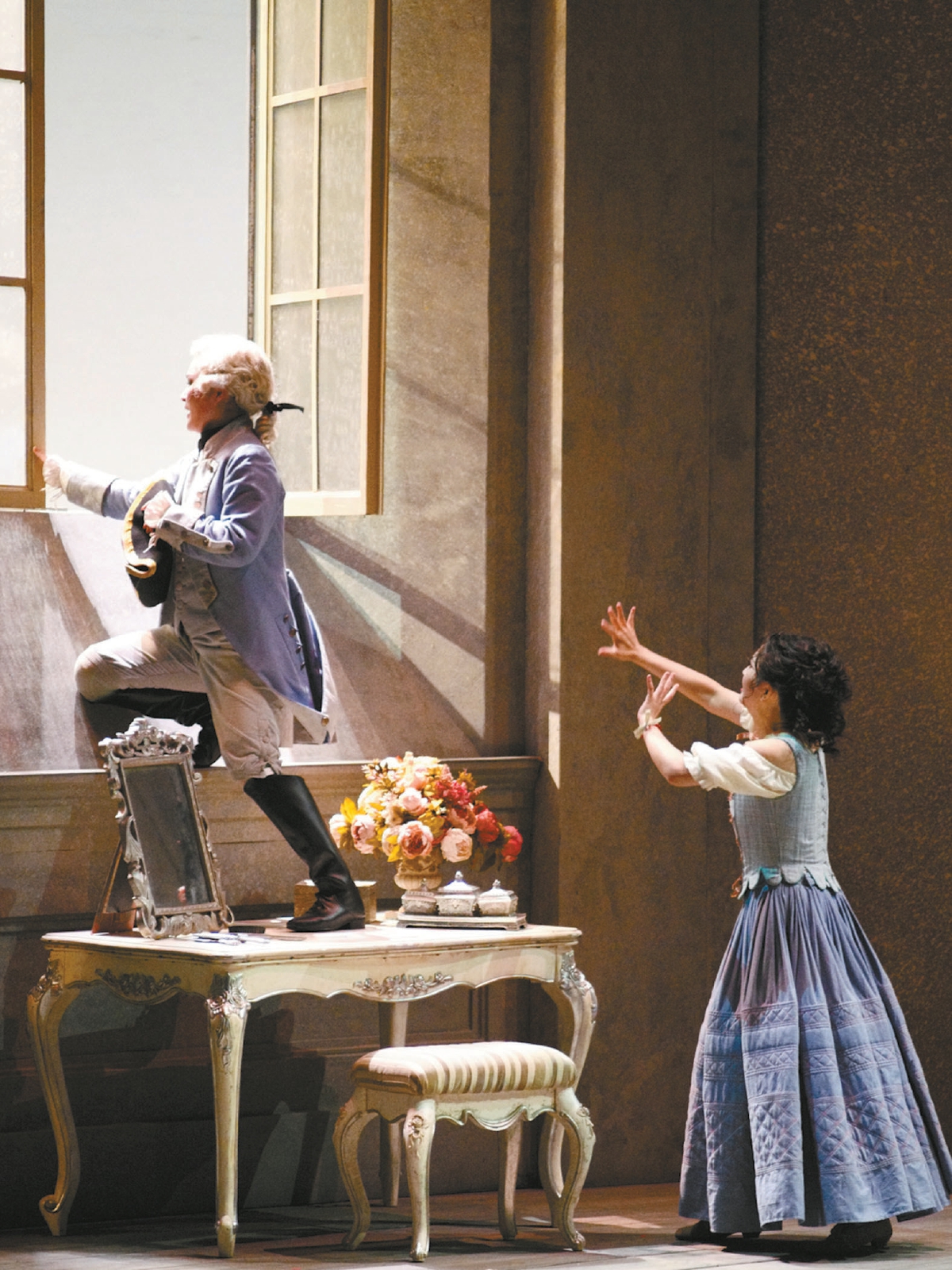 奧地利男中音馬庫斯·維爾巴飾演的費(fèi)加羅一登場便贏得滿堂喝彩。他以渾厚圓潤的音色與精湛的表演技巧,將這位機(jī)智勇敢的男仆形象刻畫得入木三分。在詠嘆調(diào)“如果你想跳舞”中,維爾巴與國家大劇院合唱團(tuán)的默契配合將劇情推向首個高潮,合唱團(tuán)飽滿和諧的和聲為音樂增添了絢麗色彩。第一幕結(jié)尾處,維爾巴演唱的著名詠嘆調(diào)“再不要去做情郎”以明快有力的旋律與溫柔勸導(dǎo)的宣敘調(diào)交替呈現(xiàn),生動展現(xiàn)了費(fèi)加羅幽默風(fēng)趣與堅定勇敢的雙重性格,鏗鏘有力的演唱贏得全場掌聲雷動。