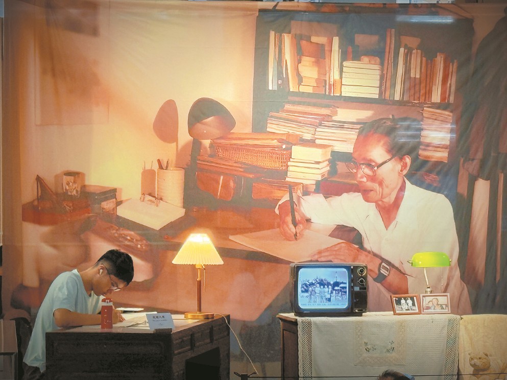 上圖東館手稿主題館展覽現(xiàn)場,小讀者在主視覺區(qū)的仿真書桌與夏衍“對坐”。(主辦方供圖)