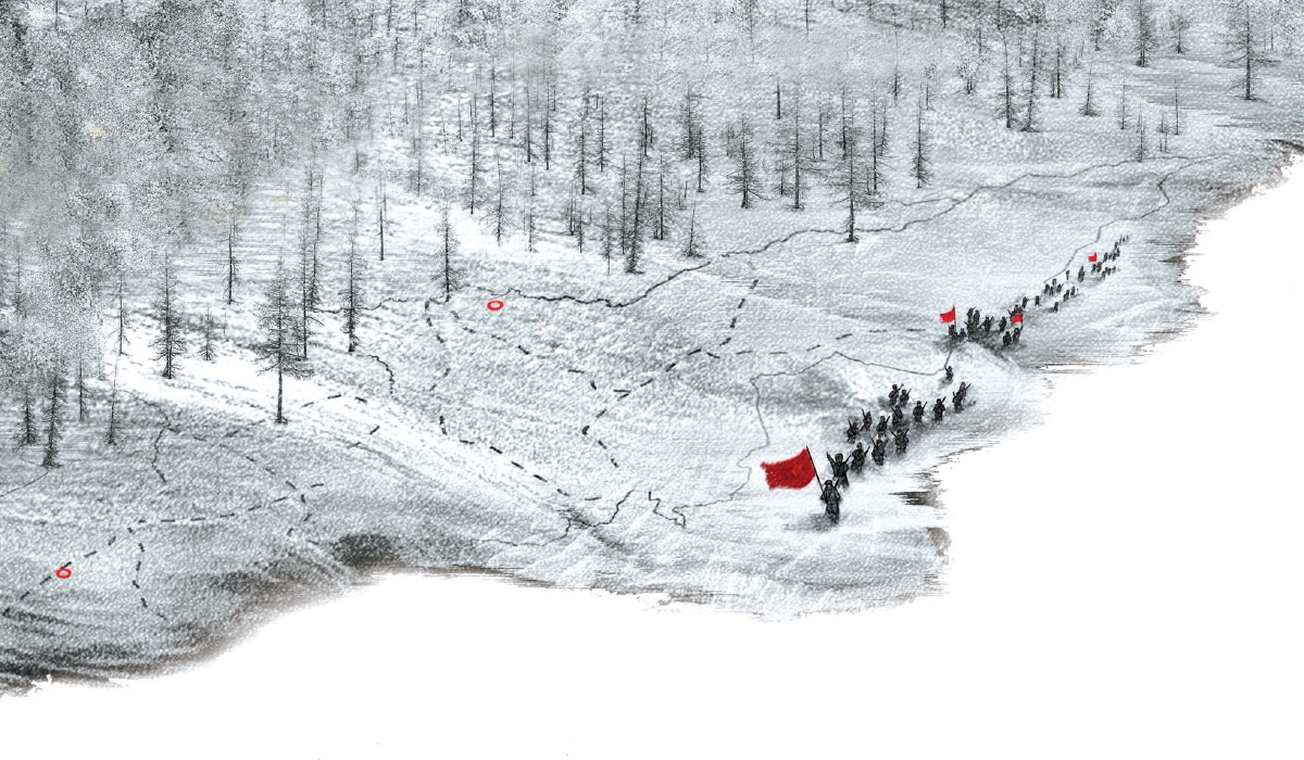 每年很長(zhǎng)時(shí)間,這里的氣候不適合室外生存,冬季氣溫更低至零下三四十度,有人的耳朵、手指、腳趾甚至?xí)粌龅簟H哲妼?dāng)?shù)卮迕駨?qiáng)制集中居住,抗聯(lián)得不到食物、衣服等。正如《歸隊(duì)》中所呈現(xiàn)出來的那樣:戰(zhàn)士們輕易不能生火取暖,深可沒腰的積雪限制了我方移動(dòng),行蹤又很容易被發(fā)現(xiàn)——敵人會(huì)沿著雪地上的腳印,進(jìn)行追擊。