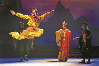 此外,該劇還利用舞臺技術突破了傳統(tǒng)戲曲的節(jié)奏,使之更為緊湊連貫。比如白骨精定下計謀要去偵探唐僧情況時,舞臺光暗,一個發(fā)光小球飛升直達天幕,暗示白骨精元神飛出洞府,同時伴有類似影視音效作為烘托;而在唐僧狠心驅(qū)逐孫悟空時,孫悟空向八戒沙僧交代完后,從上場門下場,后場馬上就安排一個孫悟空替身吊威亞從上場口飛到下場口,過程連貫自然,這都是受到電影藝術啟發(fā)的創(chuàng)新。