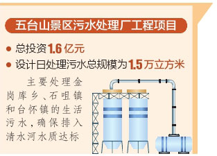 五臺山景區(qū)污水處理廠工程項目總投資1.6億元,設計日處理污水總規(guī)模為1.5萬立方米,主要處理金崗庫鄉(xiāng)、石咀鎮(zhèn)和臺懷鎮(zhèn)的生活污水,確保排入清水河水質達標。