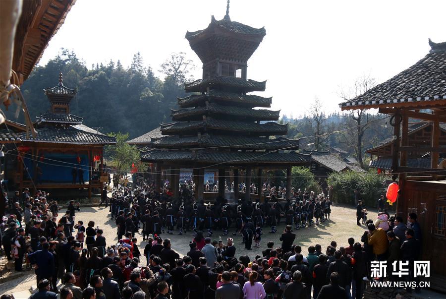 2月17日,貴州省黔東南苗族侗族自治州黎平縣巖洞鎮(zhèn)述洞村開展一年一度的“鼓樓之宗”活動。侗族老人在當地最古老的鼓樓——始建于明代的獨柱鼓樓講述侗族遷徙歷程,告誡大家要敬老尊賢、和睦相處、團結友善,侗族青年男女身著節(jié)日盛裝圍著鼓樓一邊踩歌堂,一邊唱遷徙古歌,之后在鼓樓旁進行“侗族大歌”對唱,感懷族群遷徙的歷史,傳承傳統(tǒng)文化。新華社發(fā)(楊代富 攝)