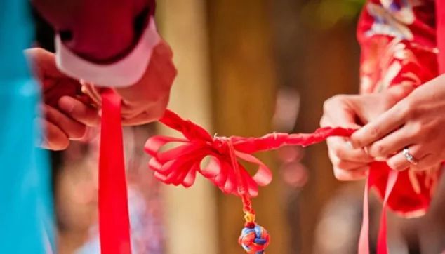 后來,人們就稱首次結(jié)婚的男女為“結(jié)發(fā)夫妻”。在有些新婚洞房中可看到火紅色的“同心結(jié)”,即是古代同心發(fā)結(jié)的延伸,“結(jié)”字取其堅固、結(jié)伴、結(jié)合之意。
