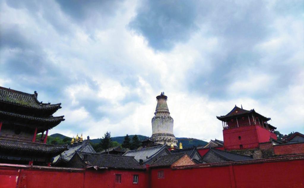 五臺山最具代表性的鈴聲就是從塔院寺高聳入云的大白塔上傳出的風鈴聲。大白塔環(huán)周83.8米,通高75.3米,塔高56.4米,比北京北海白塔還高20.5米,比代縣阿育王塔高16.5米,是元大德五年(1301年)由尼泊爾匠師阿尼哥設計建造的尼泊爾式大塔,也是我國現(xiàn)存元代最高的覆缽式塔建筑。大白塔基座呈東、西、南、北、東南、東北、西南、西北八角形,塔身上面13層,呈由粗及細的輪狀造型,稱“十三天”,又名“十三相輪”?!笆臁鄙厦嫔w著8塊銅板,按乾、坎、艮、震、巽、離、坤、兌八卦位置安裝,周長23.1米,檐邊吊裝銅質垂檐36塊,共安裝風鈴108個,連同束腰風鈴共252個。塔頂裝有高5.4米的鍍金寶瓶。整座白塔形如藻瓶,上下比例協(xié)調,造型別致典雅。每當風吹鈴響,風鐸鳴四端,悠然成風韻,讓人油然而生崇敬之感。