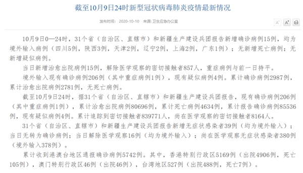 人民網北京10月10日電(許曉華)國家衛(wèi)生健康委于今日在官網發(fā)布的《截至10月9日24時新型冠狀病毒肺炎疫情最新情況》(以下簡稱“情況”)提出,10月9日0—24時,31個?。ㄗ灾螀^(qū)、直轄市)和新疆生產建設兵團報告新增確診病例15例,均為境外輸入病例(四川5例,陜西3例,天津2例,遼寧2例,上海2例,廣東1例);無新增死亡病例;無新增疑似病例。當日新增治愈出院病例15例,解除醫(yī)學觀察的密切接觸者857人,重癥病例與前一日持平。