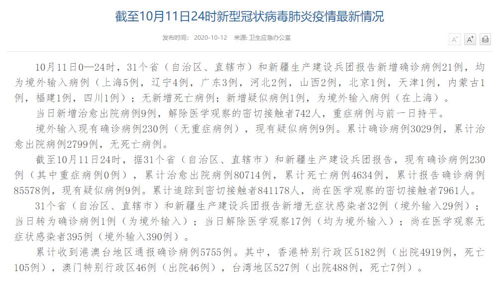 情況顯示,截至10月11日24時(shí),據(jù)31個(gè)省(自治區(qū)、直轄市)和新疆生產(chǎn)建設(shè)兵團(tuán)報(bào)告,現(xiàn)有確診病例230例(其中重癥病例0例),累計(jì)治愈出院病例80714例,累計(jì)死亡病例4634例,累計(jì)報(bào)告確診病例85578例,現(xiàn)有疑似病例9例。累計(jì)追蹤到密切接觸者841178人,尚在醫(yī)學(xué)觀察的密切接觸者7961人。