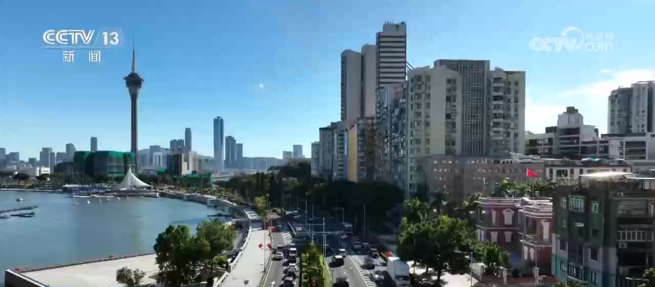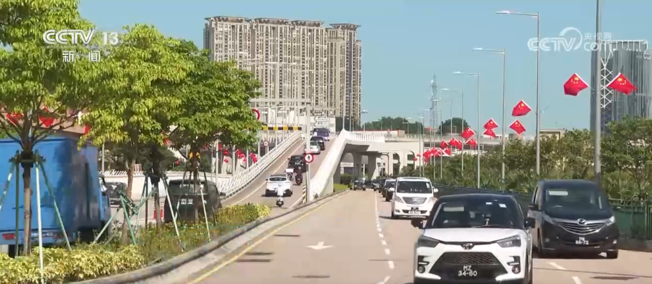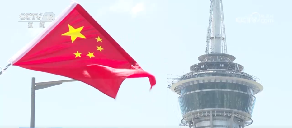 在澳門的主要街道、出入境口岸等地,鮮艷的五星紅旗迎風(fēng)飄揚,在藍(lán)天、綠樹的映襯下,構(gòu)成了一道道亮麗的風(fēng)景線,為城市增添了喜慶祥和的國慶氛圍。