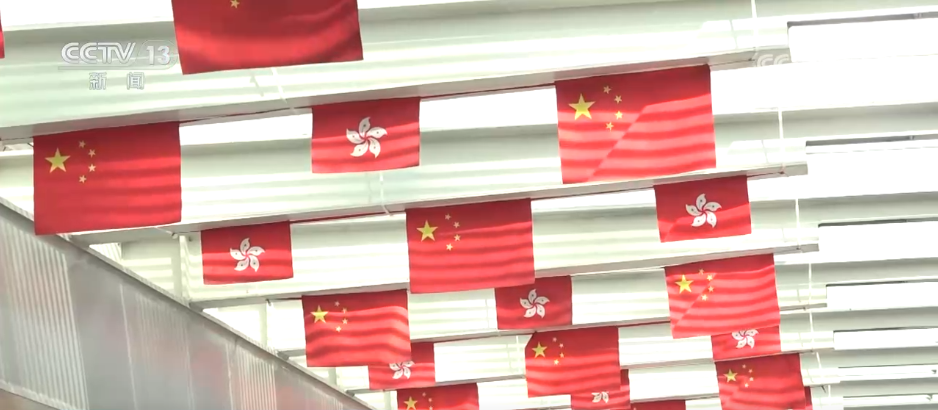 在香港的街頭巷尾,五星紅旗與紫荊花區(qū)旗迎風(fēng)飄揚,祝福標(biāo)語和慶祝海報處處可見,節(jié)日氣氛濃郁。