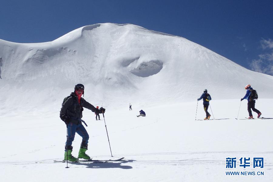 ↑記者第一次見到劉百靈是在第十六屆西藏登山大會(huì)滑雪登山項(xiàng)目的營(yíng)地——洛堆峰雪線處,海拔5600米。劉百靈膚色黑得發(fā)亮,與身邊長(zhǎng)年從事高山訓(xùn)練的藏族教練無(wú)異。但細(xì)問(wèn)起來(lái),他說(shuō)自己生在湖南,現(xiàn)居杭州,是地道的南方人。 因?yàn)閷?duì)戶外運(yùn)動(dòng)尤其是對(duì)滑雪的執(zhí)著,劉百靈的膚色變了,過(guò)起了旁人眼中的另一種人生,也成了“異類”。但他卻感謝自己成了“異類”。這是10月4日,滑雪愛好者、“體育旅游”探索者劉百靈(左)在位于西藏自治區(qū)當(dāng)雄縣羊八井鎮(zhèn)的洛堆峰雪坡上練習(xí),此處海拔約5700米。遠(yuǎn)處的山峰是海拔7048米的窮母崗日峰。 新華社發(fā)