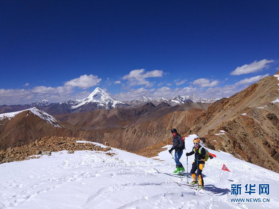 ↑這是10月4日,滑雪愛好者、“體育旅游”探索者劉百靈(左)在位于西藏自治區(qū)當(dāng)雄縣羊八井鎮(zhèn)的洛堆峰雪坡上進(jìn)行練習(xí),此處海拔約5700米。遠(yuǎn)處的山峰是海拔6010米的洛堆峰。 新華社發(fā)