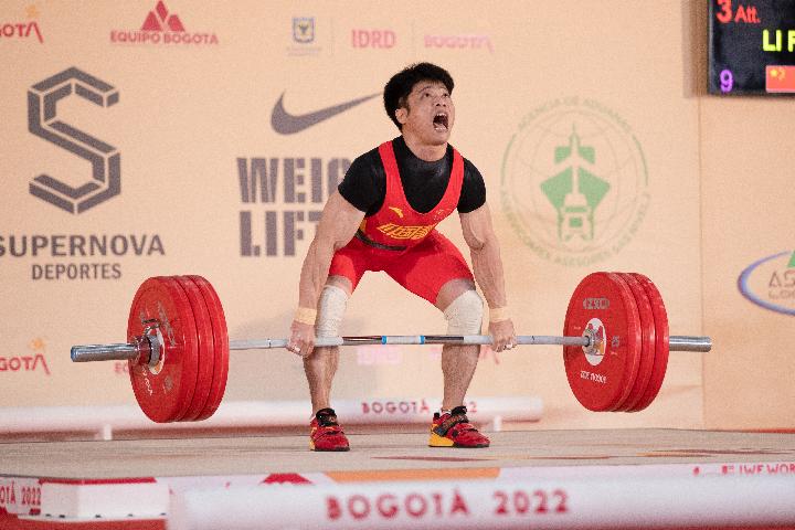 2022年12月7日,中國(guó)選手李發(fā)彬在挺舉比賽中。新華社記者王天聰攝