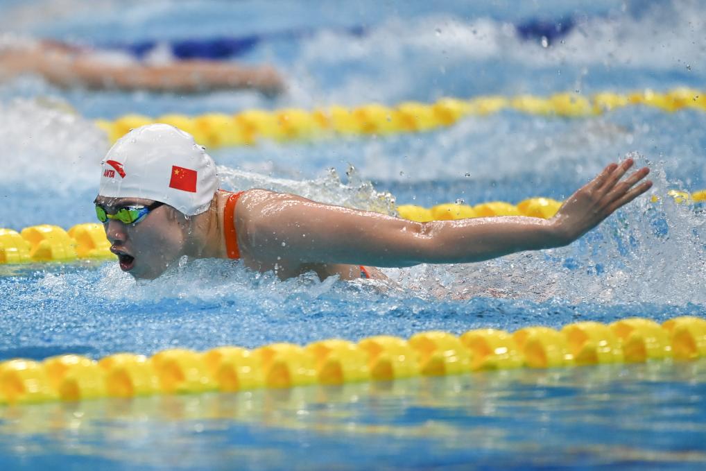 張雨霏在“韻味杭州”2023年全國(guó)游泳冠軍賽女子100米蝶泳決賽中(2023年5月4日攝)。新華社記者黃宗治攝