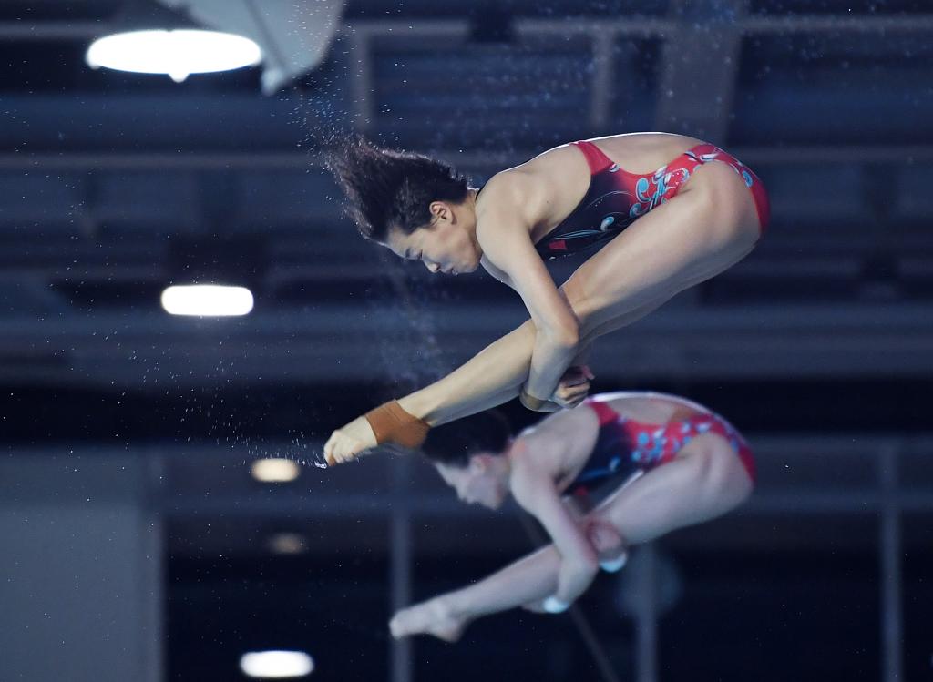 8月4日,陳芋汐/全紅嬋(上)在比賽中。新華社記者任鵬飛攝