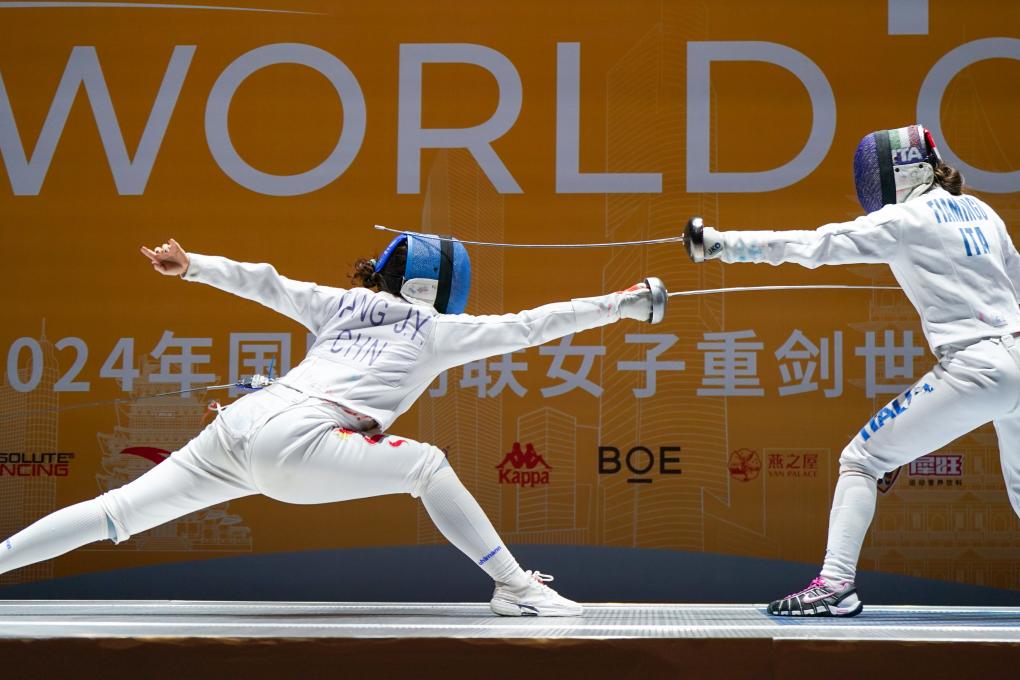當(dāng)日的團(tuán)體賽中,兩隊(duì)首輪輪空后在八分之一決賽相遇。由東京奧運(yùn)會冠軍孫一文和三名年輕小將唐君瑤、余思涵和許諾組成的中國隊(duì)開局后一路領(lǐng)先,最終以45:33戰(zhàn)勝中國香港隊(duì)。