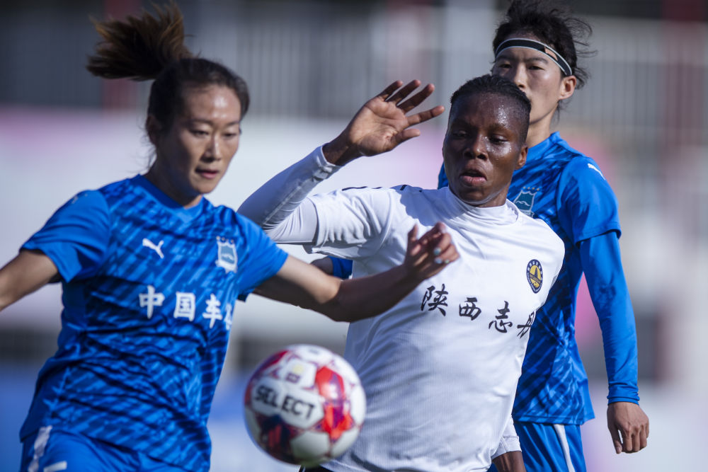 9月28日,陜西志丹隊(duì)球員朱麗葉·伊莫·貝希(中)和武漢車(chē)谷江大隊(duì)球員吳海燕(左)在比賽中拼搶。新華社記者 伍志尊 攝