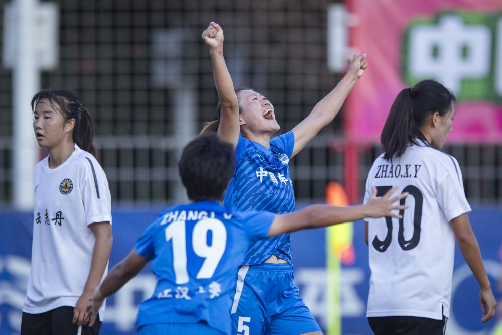 9月28日,武漢車(chē)谷江大隊(duì)球員吳海燕(右二)進(jìn)球后慶祝。新華社記者 伍志尊 攝