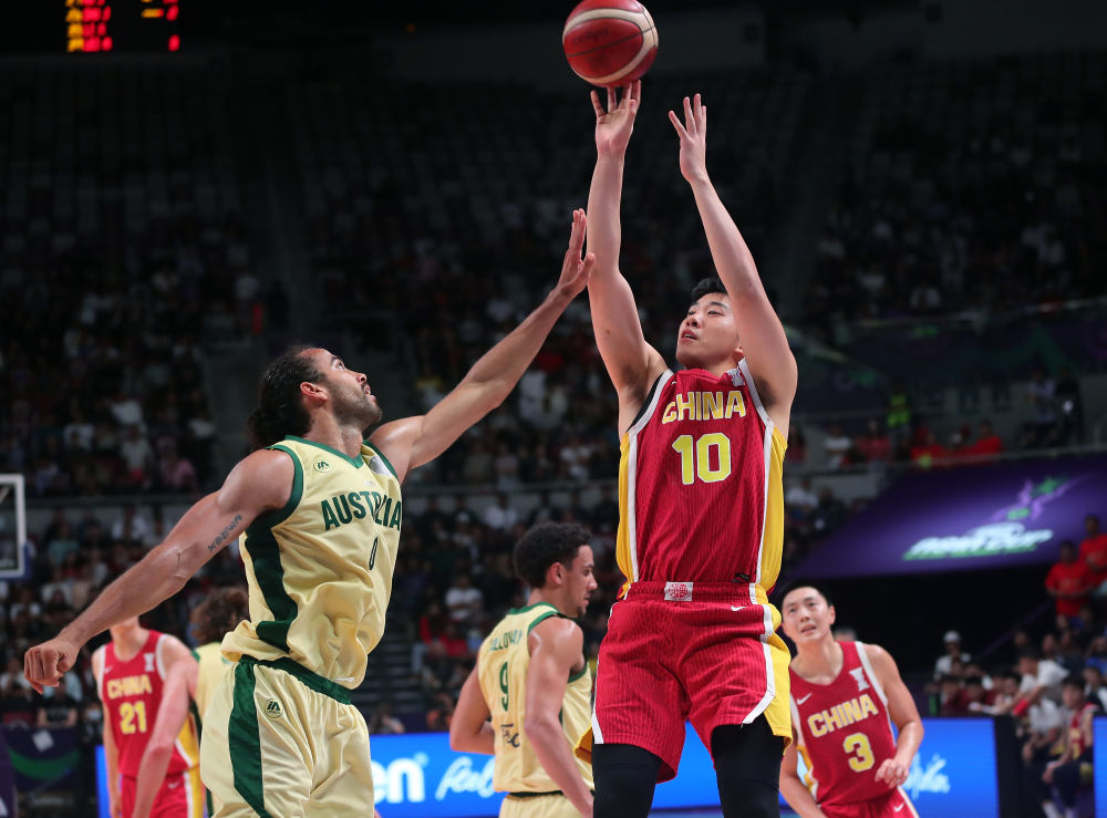 8月17日,中國隊(duì)球員王俊杰(前右)在比賽中投籃。新華社記者 王東震 攝