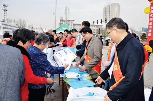 忻州市水資辦的工作人員在街頭進行涉水法律法規(guī)和節(jié)水知識宣傳
