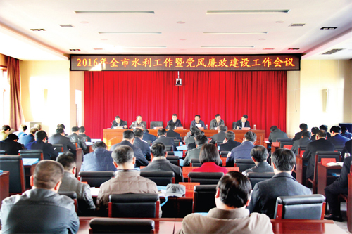 2016年全市水利工作暨黨風(fēng)廉政建設(shè)工作會議現(xiàn)場 “十三五”時期,是全面建成小康社會的決勝階段,是全面加快水利改革發(fā)展的關(guān)鍵階段,是全面貫徹落實新時期治水方略、構(gòu)建忻州水安全保障體系的攻堅階段。 市委三屆七次全會描繪了我市未來5年發(fā)展的宏偉藍(lán)圖,把水利建設(shè)放在了“1661”發(fā)展戰(zhàn)略的重要位置,作為“十三五”脫貧攻堅和全面小康的重大基礎(chǔ)設(shè)施建設(shè)工程予以部署和推動。我們要按照市委、市政府的要求,準(zhǔn)確把握國家、省、市水利工作的新形勢新任務(wù)新要求,堅持“節(jié)水優(yōu)先、空間均衡、系統(tǒng)治理、兩手發(fā)力”的水利工作方針,全力抓好水安全、水生態(tài)建設(shè)六大工程,圍繞水利重點項目建設(shè),突出解決好“水源、水少、水臟、水遠(yuǎn)、水漏、水失”等重大水問題,強(qiáng)化水支撐,修復(fù)水生態(tài),為全市經(jīng)濟(jì)社會發(fā)展提供堅強(qiáng)的水利基礎(chǔ)。 “十三五”全市水利發(fā)展的總體思路: 以中央和我省新時期治水發(fā)展戰(zhàn)略為指引,緊緊圍繞我市“1661”發(fā)展戰(zhàn)略,以最嚴(yán)格水資源管理為主線,以保障水安全為目標(biāo),按照“開源與節(jié)流并舉,利用與保護(hù)并重”的原則,大力推進(jìn)“資源水利、工程水利、民生水利、生態(tài)水利、法治水利”建設(shè),突出解決好制約忻州經(jīng)濟(jì)社會發(fā)展的6大水問題,初步形成“節(jié)約用水、水資源配置、水生態(tài)保護(hù)、防災(zāi)減災(zāi)、法治建設(shè)”5大體系,有效保障“水資源、水供給、水生態(tài)、水環(huán)境、水工程”5大安全,為全面建成小康社會提供更加堅實的水安全保障。 主要目標(biāo): 全市用水總量控制在7.7億立方米以下;萬元工業(yè)增加值用水量在2015年的基礎(chǔ)上降低7%,全市重要水功能區(qū)水質(zhì)達(dá)標(biāo)率提高到73%;農(nóng)田灌溉水有效利用系數(shù)提高到0.55以上;鞏固提升148.13萬農(nóng)村人口的飲水安全質(zhì)量,農(nóng)村自來水普及率達(dá)到98%,集中供水率達(dá)到98%,水質(zhì)檢測率達(dá)到100%;全市農(nóng)田灌溉有效控制面積達(dá)到230萬畝,實現(xiàn)農(nóng)業(yè)人口人均1畝水澆地的目標(biāo);新增水土流失治理面積2500平方公里,水土流失累計治理度達(dá)到60.2%。 重點工作: 1、全面啟動以水源地、三河流域治理為重點的水資源與水生態(tài)修復(fù)保護(hù)工程建設(shè)。強(qiáng)化水資源管理和保護(hù),實施最嚴(yán)格水資源管理制度,限制開采地下水,確保全市水生態(tài)環(huán)境持續(xù)改善;加大重點泉域、重要水功能區(qū)的監(jiān)測力度及山洪災(zāi)害預(yù)警預(yù)報體系建設(shè),保護(hù)好黃河、汾河、滹沱河等主要河流;合理調(diào)整城鎮(zhèn)供水方式,啟動坪上引水工程供水及水泉灣水源地保護(hù),實施水源地調(diào)整、置換,提升中心城市居民用水質(zhì)量。統(tǒng)籌自然生態(tài)多要素,加快汾河、滹沱河、桑干河等重點流域的綜合治理與生態(tài)修復(fù);加強(qiáng)重點流域和區(qū)域水污染防治,推進(jìn)工業(yè)園區(qū)、工業(yè)集中區(qū)、工業(yè)企業(yè)污水深度處理,加快城鎮(zhèn)生活污水處理廠擴(kuò)容提質(zhì)和中水回用;堅持保護(hù)優(yōu)先、自然恢復(fù)為主,統(tǒng)籌山水林田湖綜合治理,改善流域生態(tài)環(huán)境;提升水利風(fēng)景區(qū)建設(shè)規(guī)模和標(biāo)準(zhǔn)。 2、加快推進(jìn)以工業(yè)和城鎮(zhèn)供水為重點的骨干水源工程建設(shè)。啟動萬家寨引黃南干線滹沱河連通工程及山西大水網(wǎng)忻州縣域供水工程,完善忻定盆地供水體系,確保受水區(qū)各縣配套工程與大水網(wǎng)工程同步建成、同期發(fā)揮效益;在水資源開發(fā)利用程度較低河流、邊界河流、大水網(wǎng)骨干工程等區(qū)域,興建調(diào)蓄工程和新水源工程;在西部沿黃地區(qū)實施黃河水利用工程。通過加強(qiáng)水利基礎(chǔ)設(shè)施建設(shè),提高新型工業(yè)項目、優(yōu)質(zhì)特色農(nóng)產(chǎn)品基地和缺水地區(qū)的供水能力。 3、努力拓寬以中水、礦坑水、雨水集蓄為重點的補(bǔ)充水源工程建設(shè)。在主要城鎮(zhèn),推進(jìn)中水回用工程;在重點礦區(qū),推進(jìn)礦坑水集中利用工程;在山區(qū)農(nóng)村,大力發(fā)展雨水集蓄利用工程。 4、全力實施以農(nóng)村飲水安全、防洪保安為重點的民生水利工程建設(shè)。全力實施農(nóng)村飲水安全鞏固提升工程,切實保障居民飲水安全,推進(jìn)自來水全面普及;在主要干流和重要支流開展河道治理;加快病險水庫除險加固;全力實施抗旱應(yīng)急水源工程,增強(qiáng)抗旱應(yīng)急保障能力。 5、大力加強(qiáng)以農(nóng)業(yè)灌溉為重點的節(jié)水工程建設(shè)。加強(qiáng)大中型灌區(qū)續(xù)建配套與節(jié)水改造,加快小型農(nóng)田水利工程建設(shè)步伐,全面實施膜下滴灌等高效節(jié)水工程,繼續(xù)抓好中央財政小型農(nóng)田水利建設(shè)重點縣項目,有效改變農(nóng)業(yè)生產(chǎn)靠天吃飯的局面。 6、穩(wěn)步提升以水面、水能資源為重點的水產(chǎn)水電工程建設(shè)。繼續(xù)抓好小水電代燃料項目建設(shè),加快發(f