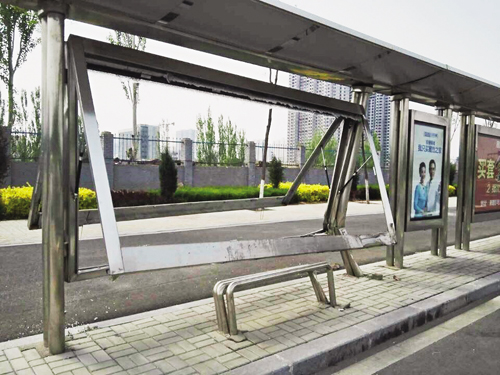 見到記者拍照,一位巡邏民警說,這個站牌是前兩天被車撞壞的,因?yàn)槭切侣?,公交站牌還未投入使用。這條道路行人車輛稀少,肇事車輛已不知去向,也沒有目擊者。一位開車路過此處的司機(jī)說,這么漂亮的站牌,被車撞成這樣,看著讓人心疼,希望有關(guān)部門加強(qiáng)監(jiān)管,嚴(yán)格懲罰力度。同樣,廣大市民也應(yīng)積極行動起來,愛護(hù)公共設(shè)施,維護(hù)候車環(huán)境。圖為云中北路慘遭破壞的公交站牌(張志遠(yuǎn) 孫明)