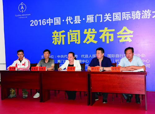 七月盛夏,古郡雁門,瓜果飄香,喜氣盈門。以“騎游中華第一關(guān),逐鹿千年古驛道”為主題的2016中國·代縣·雁門關(guān)國際騎游大會定于7月29日至30日隆重舉行,將云集來自全球20多個國家和地區(qū)的1000多名在國際、國內(nèi)自行車賽事中初具影響力的職業(yè)、業(yè)余選手參加。標(biāo)準(zhǔn)之高,規(guī)模之大,盛況空前。為了給雁門關(guān)國際騎游大會宣傳造勢,營造濃厚氛圍,大會組委會于7月20日下午在新城體育館會議室舉行2016中國·代縣·雁門關(guān)國際騎游大會新聞發(fā)布會,特邀來自省市新聞媒體的20多位記者參加。出席新聞發(fā)布會的領(lǐng)導(dǎo)有政府副縣長、大會組委會副主任劉愛珍,國家體育總局扶貧工作組組長、大會組委會副主任李立東,代縣體育運動管理中心主任、大會組委會委員侯發(fā)平,深圳天珺體育咨詢有限公司賽事總監(jiān)張學(xué)勇。