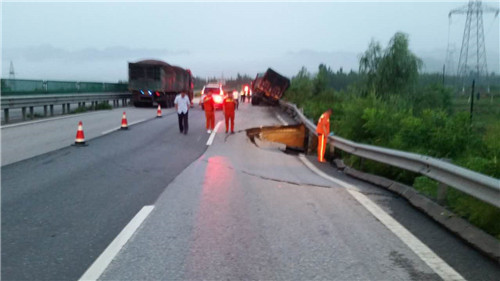經現(xiàn)場勘查,路面大約有15M*8M的路基沉降和邊坡塌陷的較大水毀,塌陷范圍涉及到道路應急車道、路肩及行車道,僅超車道可以通行,如繼續(xù)行駛超車道也存在較大安全隱患。